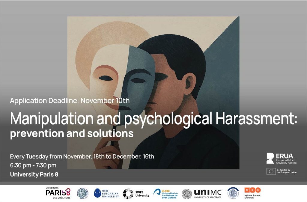This course will help you better understand manipulation and psychological harassment process, exploring its mechanisms and issues. It’s particularly useful for university students, who will be introduced in workplace environment in the next future, needing to be aware of psychosocial risks.