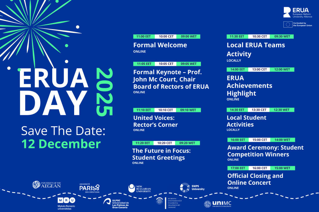 A full day dedicated to community, creativity, and collaboration across the European Reform University Alliance. We are excited to announce the ERUA Day Celebrations, taking place on Friday, 12 December 2025! Once more this year’s celebration brings together students, staff, faculty, and researchers from all ERUA partner universities for a day of shared reflections, achievements, […]