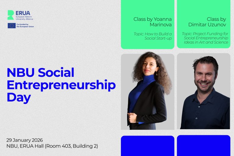 New Bulgarian University invites students from across the ERUA Alliance to take part in NBU Social Entrepreneurship Day — a practical seminar and hands-on workshop focused on social innovation. The seminar will take place on the 29th of January 2026, from 11:20 to 14:30 CET, on location at NBU and online via Zoom link.