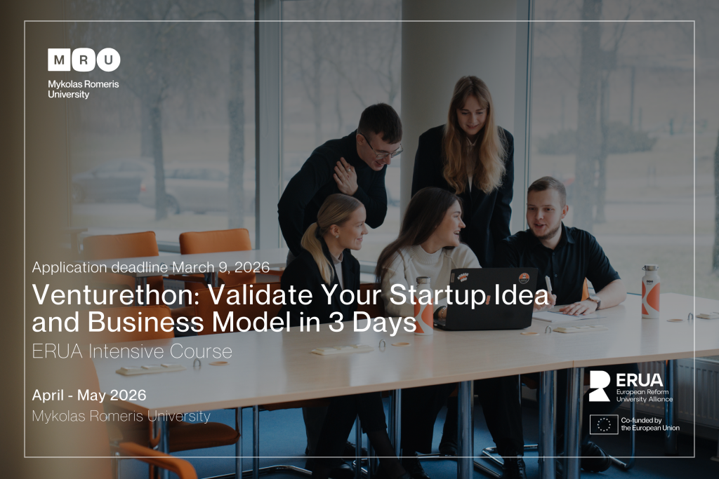 Venturethon: Validate Your Startup Idea and Business Model in 3 Days Dates: 20 – 22 of May 2026 Place: Vilnues Format: Hybrid, online and on-site Got an idea you want to test? Curious about entrepreneurship, innovation, or creating real-world impact? Mykolas Romeris University (MRU) invites Bachelor’s and Master’s students from all ERUA partner universities to […]