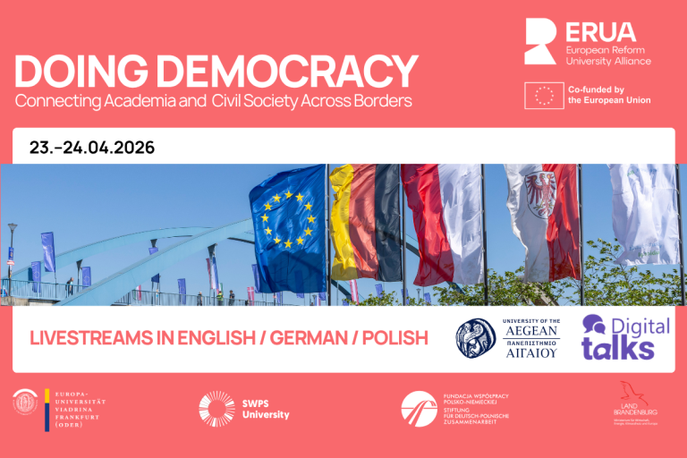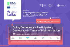On 23 April 2026, the ERUA alliance will host its 4th DigiTalk “Doing Democracy – Participatory Democracy in Times of Disinformation”. The event is part of the Digital Talk Series on “Achieving Social Change in ERUA’s Local Communities and Regions” of ERUA’s WP5, led by the University of the Aegean, and will take place within the framework of Doing Democracy: Connecting Academia and Civil Society Across Borders (23-24 April), a German-Polish initiative of European University Viadrina and SWPS University, fostering dialogue between academia and civil society on key democratic challenges.